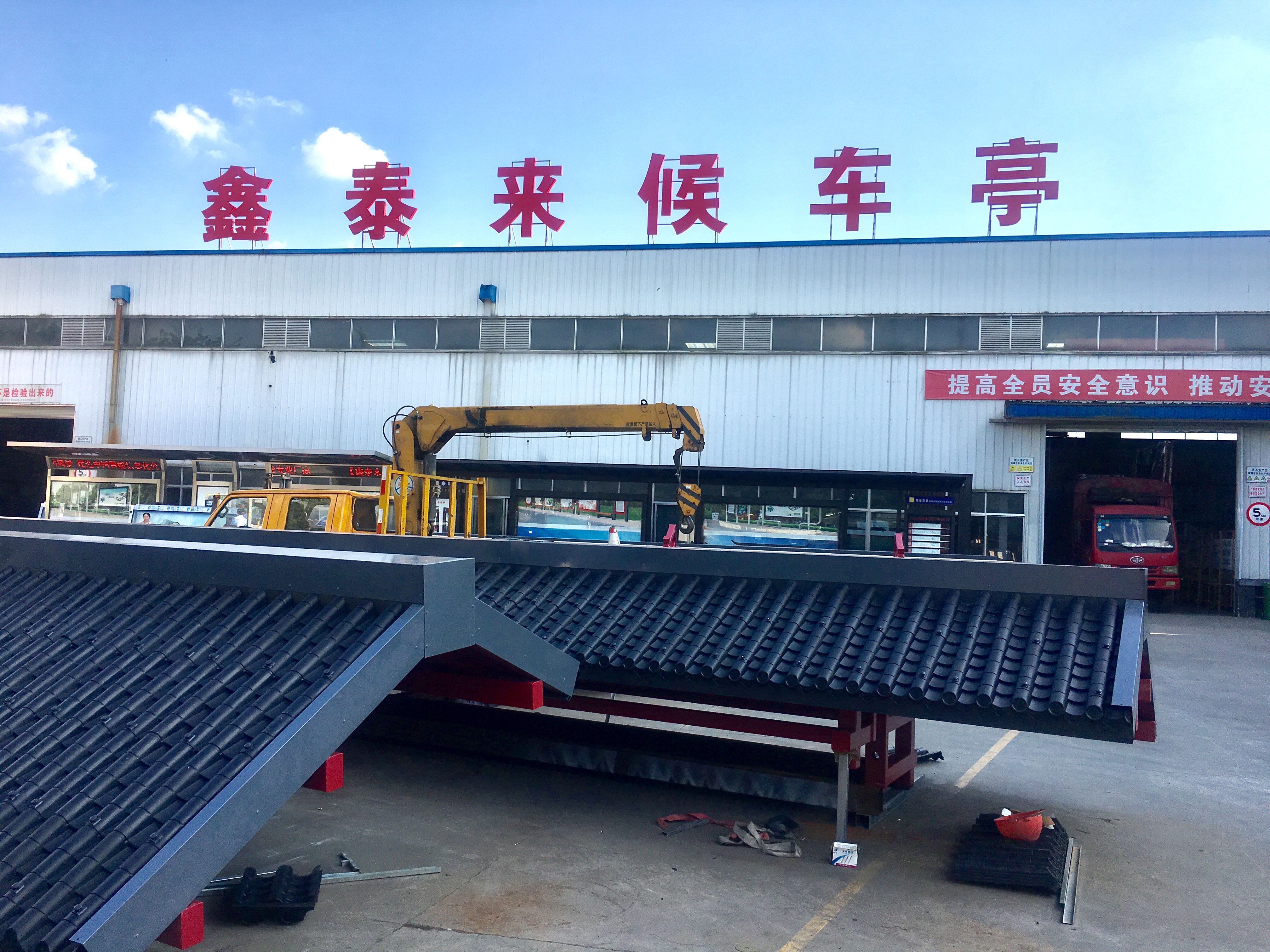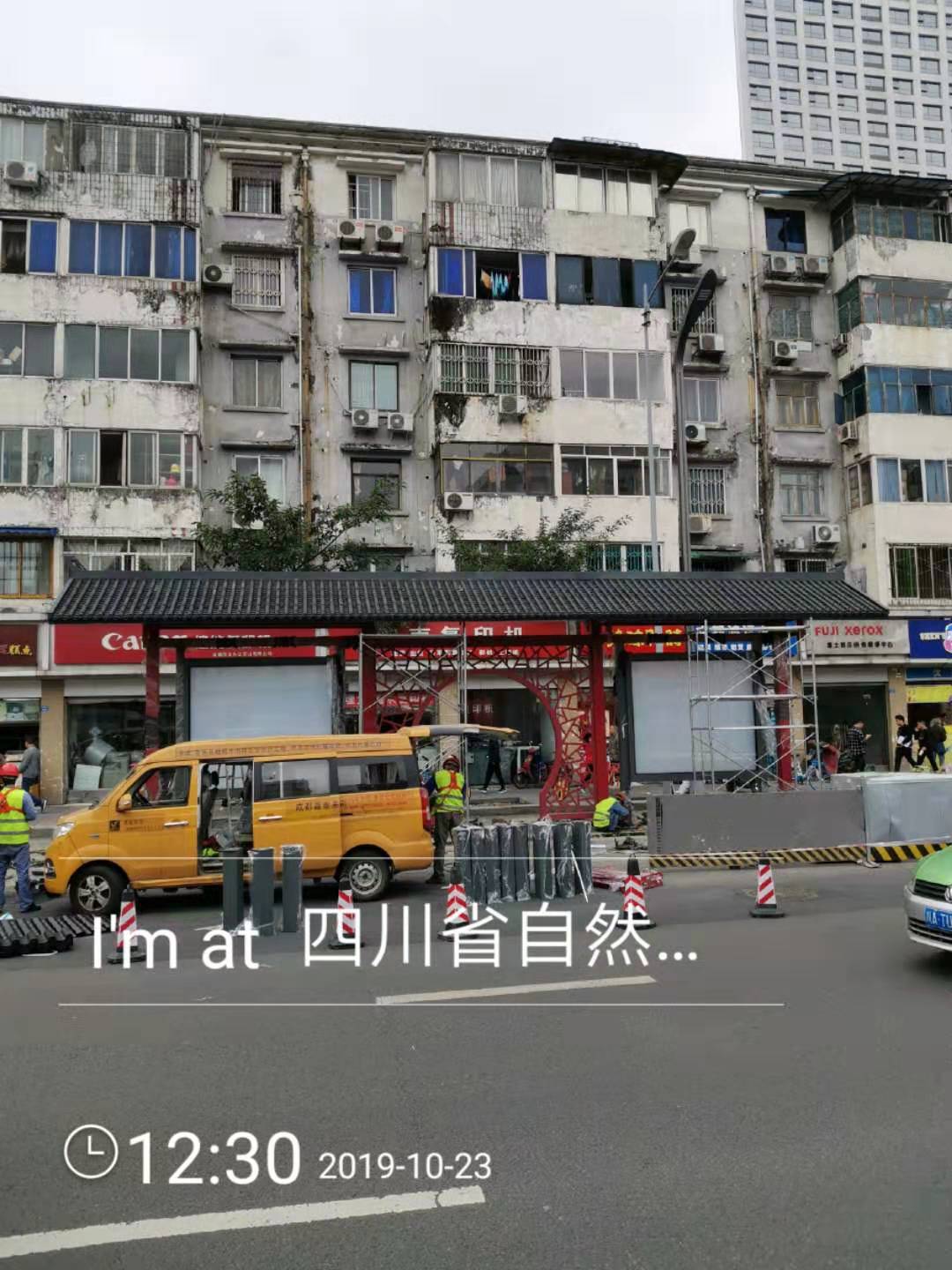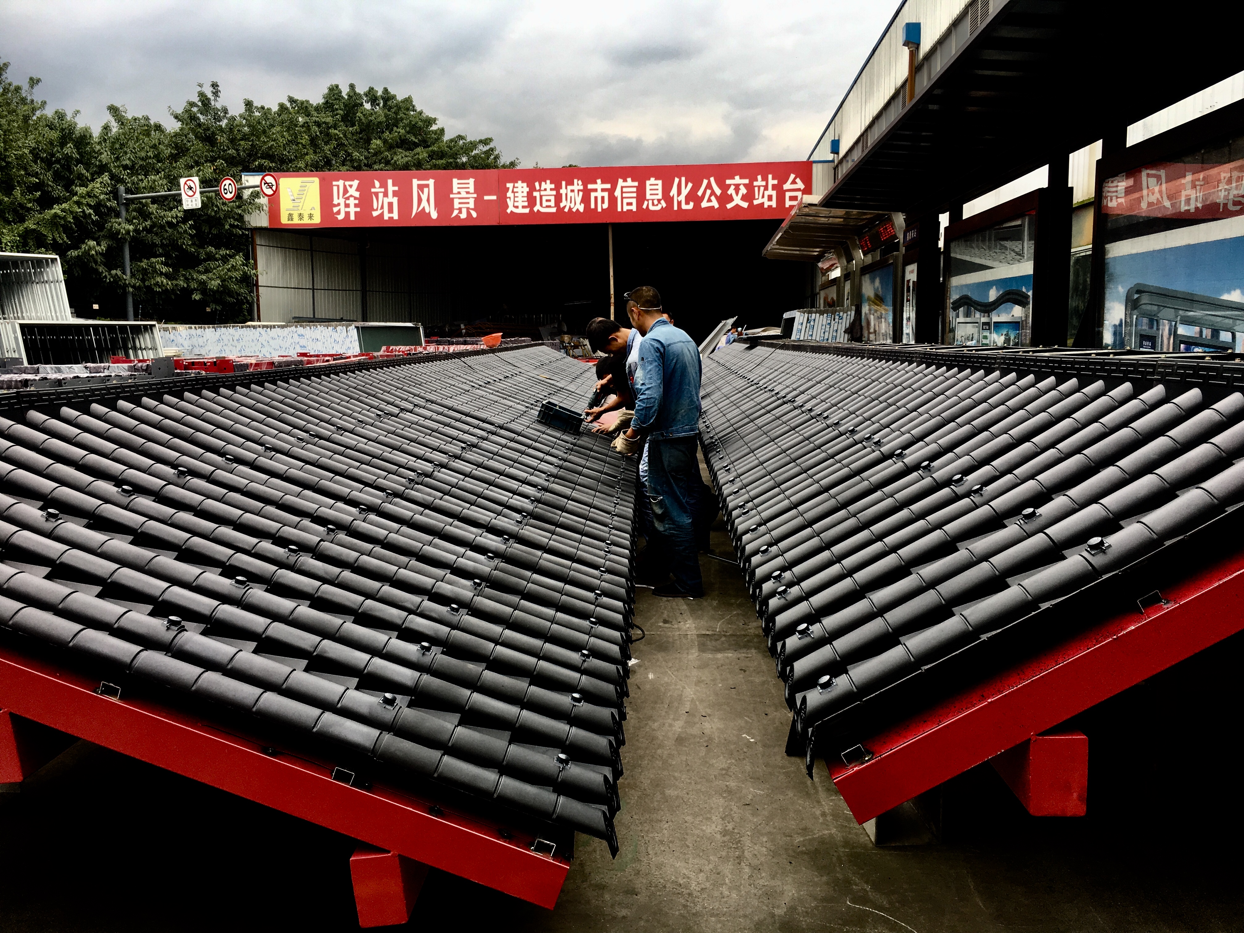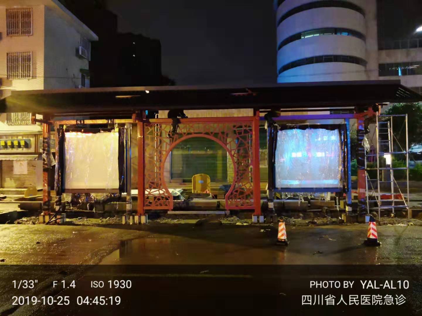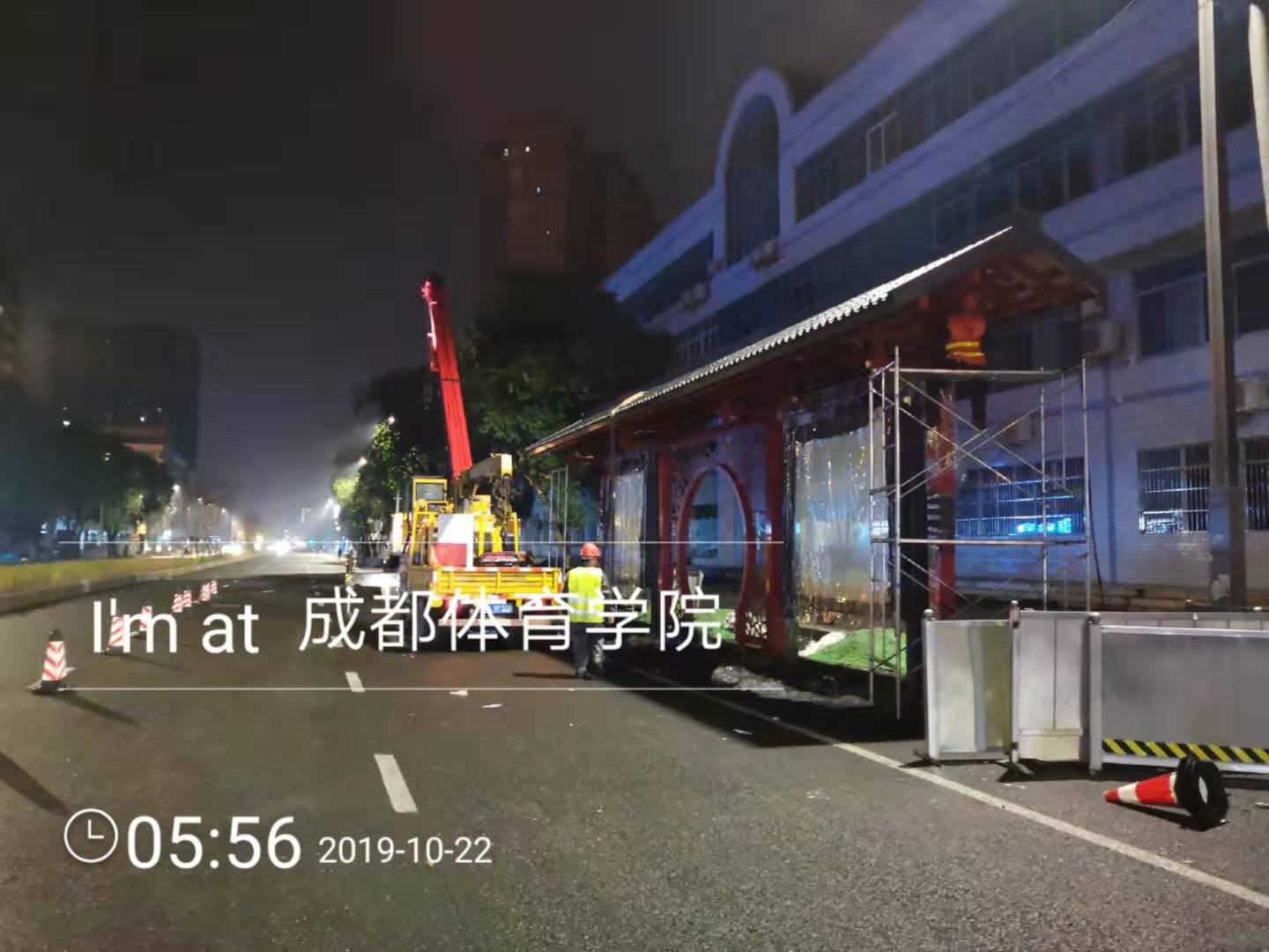 成都市一環道路綜合整治工程進行中,因現場車流量巨大等諸多不利因素,導致我司公交站臺的安裝工作全部在夜間施工完成。高效率的人力計劃和安排布署,在工程部精兵強將通力配合下,持續每夜兩座的進展速度,一座座高大的仿古公交站臺拔地而起,讓早起的當地市民驚訝不已 ,紛紛贊嘆它的壯觀和神速。
